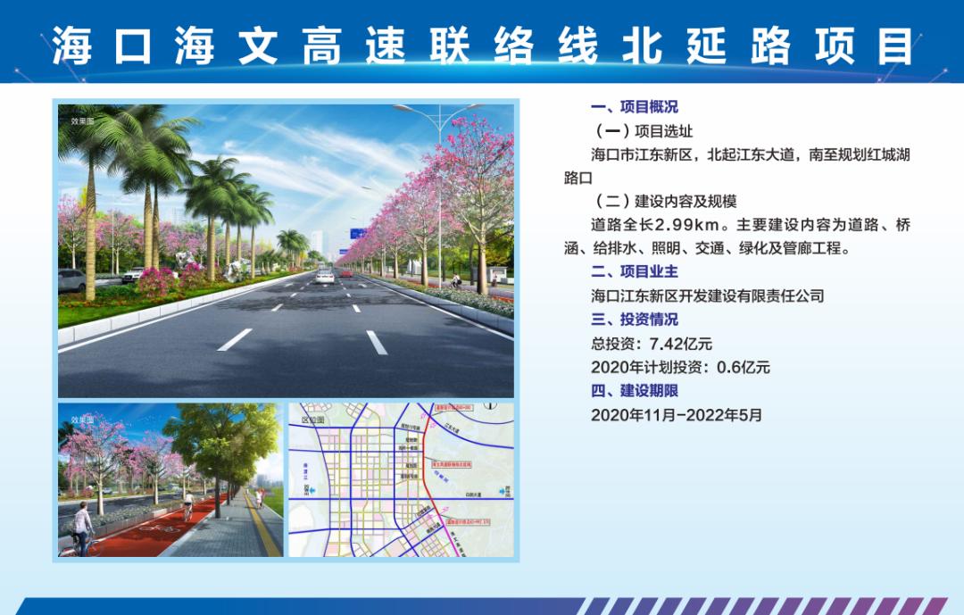 建设地点:海口江东新区。城市主干路,北起江东大道,南至红城湖路,全长2.99公里,道路红线宽50米。主要内容为道路、桥涵、给排水、照明、交通、绿化及管廊工程。