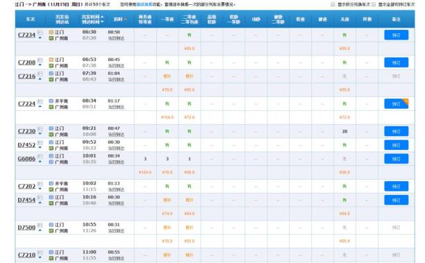 在12306售票网上,将出发地选择江门站,到达地选择广州南站,乘车日期设定为11月15日,随即跳出当天的列车信息表。据统计,11月15日当天,共有48趟列车从江门站到达广州南站,乘车耗时最短仅需30分钟。特等座/商务座价格有164元和161元两种;一等座价格在74元到76元之间;二等座价格在54元到56元之间。