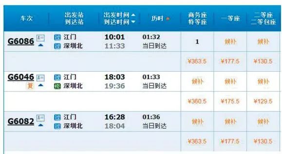 11月15日江门出发至深圳北,头班车出发时间为10:01,尾班车出发时间为18:03,耗时最短为1小时32分钟。商务座/特等座价格有360.5元和363.5元两种,一等座有177.5元和175.5元两种,二等座及无座有130.5元和129.5元两种。