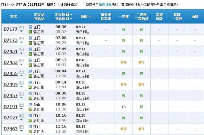11月15日江门出发至湛江西,头班车出发时间为6:36,尾班车出发时间为21:00,耗时最短为2小时12分钟。商务座/特等座价格有607元和543元两种,一等座价格在256元到324元之间,二等座价格在160元到202元之间。