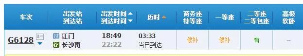 11月15日江门出发至长沙,出发时间为18:49,耗时3小时33分钟。商务座/特等座价格为1156元,一等座价格为580元,二等座及无座价格为370元。