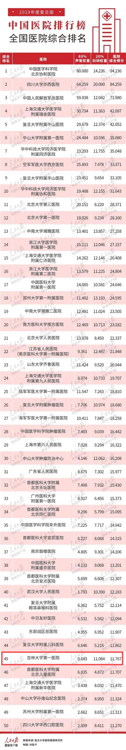 11月14日下午,复旦版《2019年度中国医院排行榜》公布!北京协和医院、四川大学华西医院和中国人民解放军总医院继续名列排行榜前三甲。吉林大学第一医院上榜,排名《2019年度中国医院排行榜(综合)》第45位。