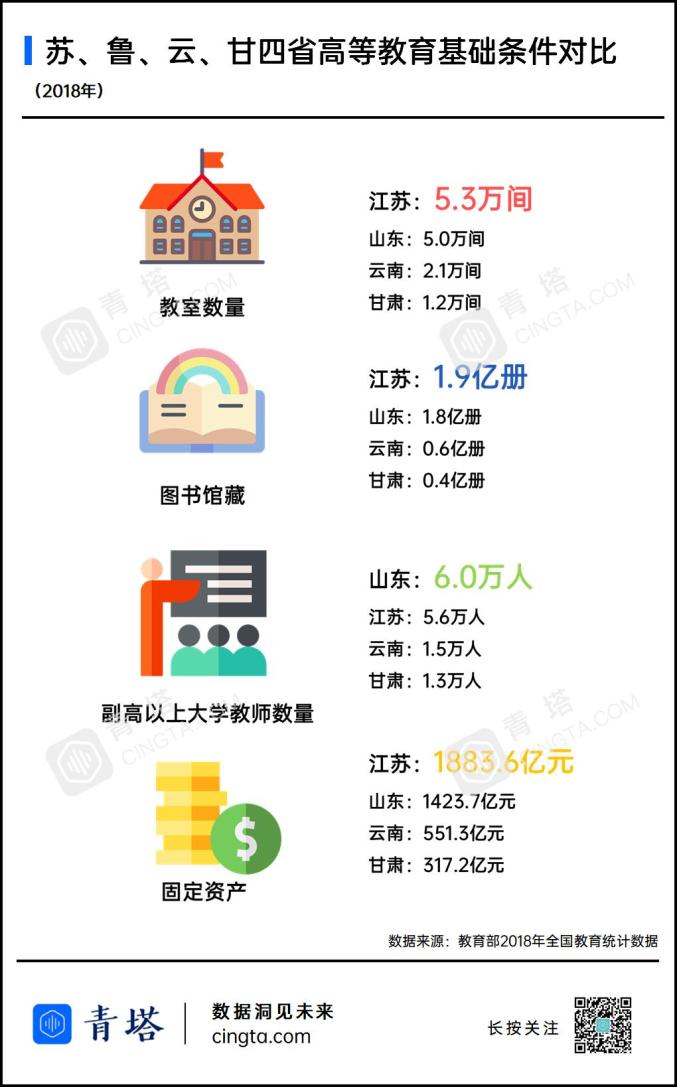在现有办学基础上,以江苏、山东、云南和甘肃为例,无论是师资力量、图书馆藏,还是教师数量和固定资产方面,江苏和山东的高等教育办学基础条件都遥遥领先。