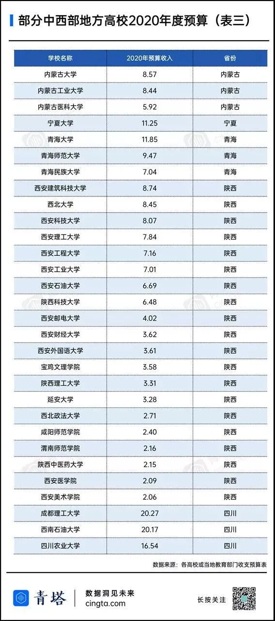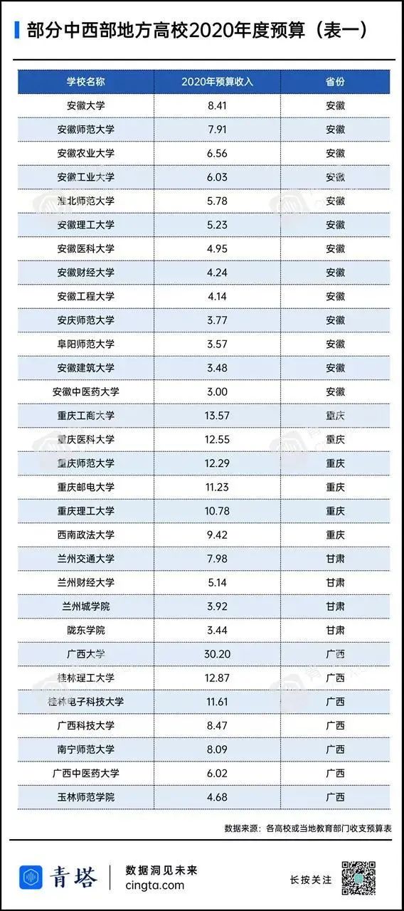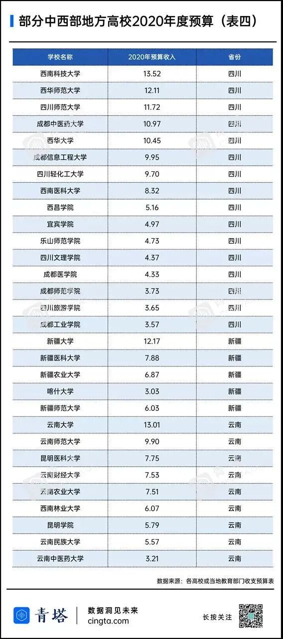 从超过300所地方高校2020年预算经费的情况来看,预算经费相对较高的前30所地方高校中,仅有4所为中西部高校,且均为“双一流”建设高校。