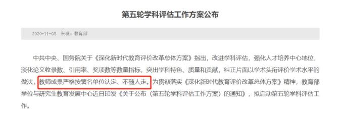 在刚刚发布的第五轮学科评估方案中更是明确,要抑制人才无序流动,教师成果严格按署名单位认定、不随人走。