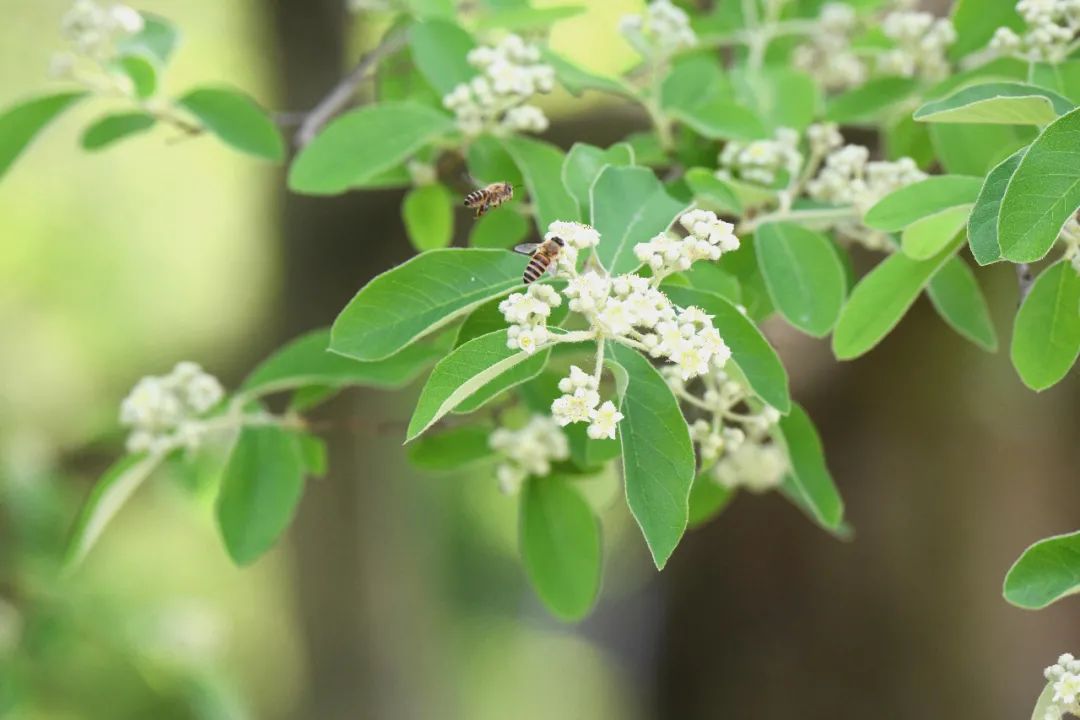 桃金娘目>胡颓子科>胡颓子属牛奶子为落叶直立灌木。植株多分枝,枝上具小刺;叶片椭圆边缘多波状,最大特点是叶背面被银白色和散生少数褐色鳞片,视觉上麻麻点点的;先花后叶,花期5-6月,开漏斗状黄白色花,有香气;秋日结果,果实卵圆,由点状奶白绿色至成熟红色。植物园中栽培做观赏植物,亦有药用价值。