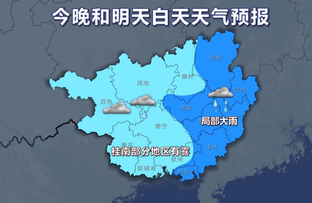 今天晚上和明天白天,桂林、贺州、来宾、梧州、贵港、玉林、北海等市的部分地区有中雨,局部大雨,我区其它地区阴天大部有小雨。桂南部分地区有雾。各地气温:桂北9~18℃,桂南13~23℃。