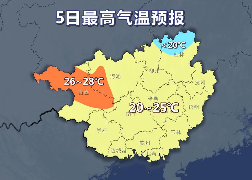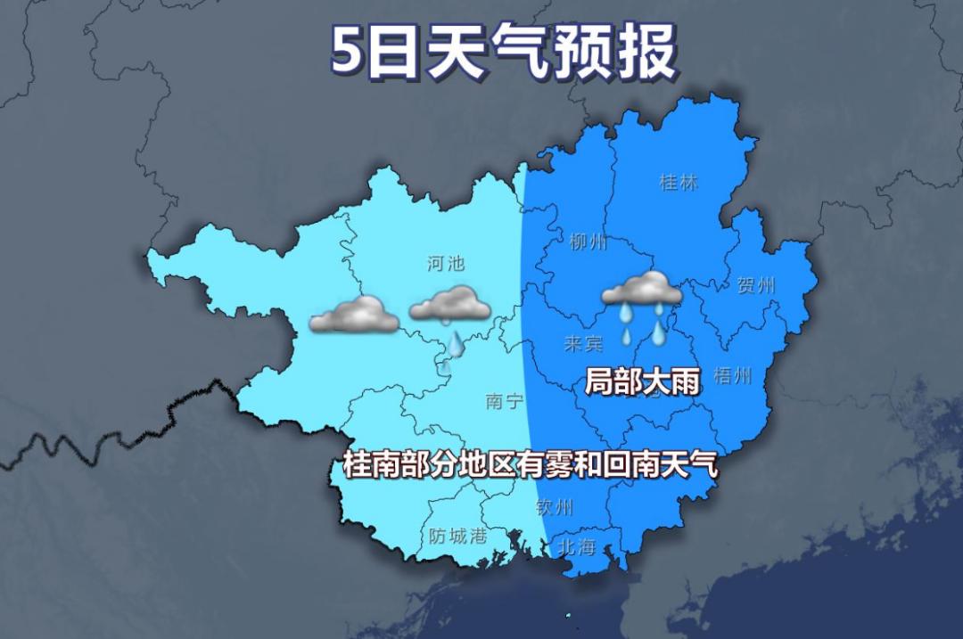 5日,桂东部分地区有中雨,局部大雨,我区其它地区阴天大部有小雨。桂南部分地区有雾和回南天气。各地气温:桂东北12~24℃,其它地区15~27℃。