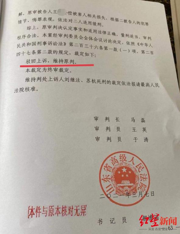 许月田之子许会也说,山东高院驳回刘继法等人的上诉,“让我们一家感受到了法律的公平公正。我父亲去世快五年了,这也算是给我父亲的一个交代。现在就希望最高院能尽快核准对刘继法、苏杭的死刑。”
