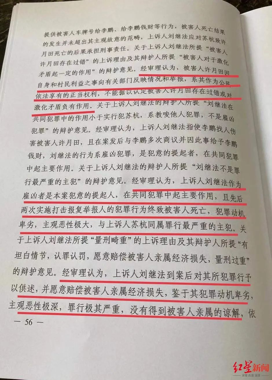 红星新闻记者获取的山东高院二审裁定书内容显示,刘继法上诉时还提出“被害人许月田存在过错”。山东高院则认为,许月田因自身和村民利益之事,向有关部门反映情况和举报,系其作为公民依法享有的正当权利,不能据以认定许月田存在过错或对激化矛盾负有作用。