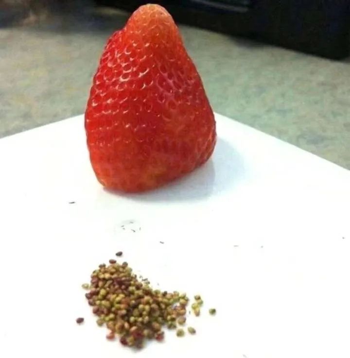 网上刷到一张图,牙医从患者牙缝里掏出一颗发了芽的草莓籽↓