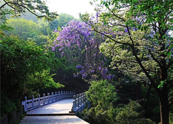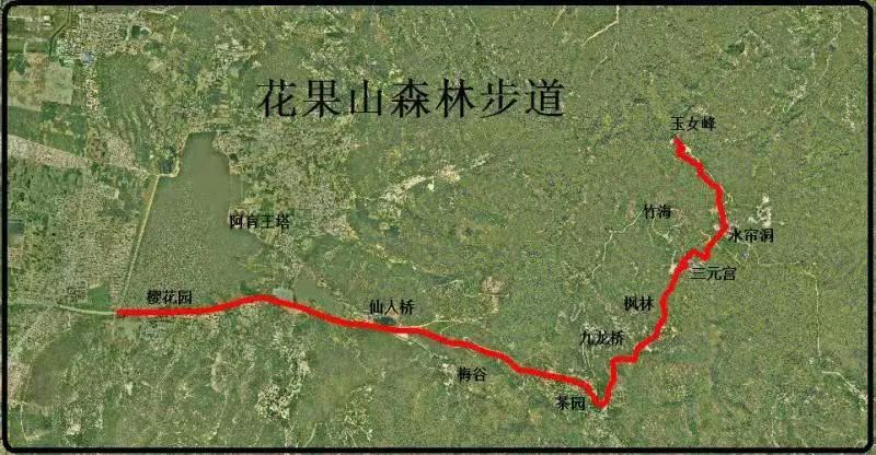 花果山森林游步道起点花果山景区大圣湖南岸,由西向东走向,终点是玉女峰。沿途景观资源丰富:樱花园、梅谷、楸树林、千年银杏群、紫薇园等。