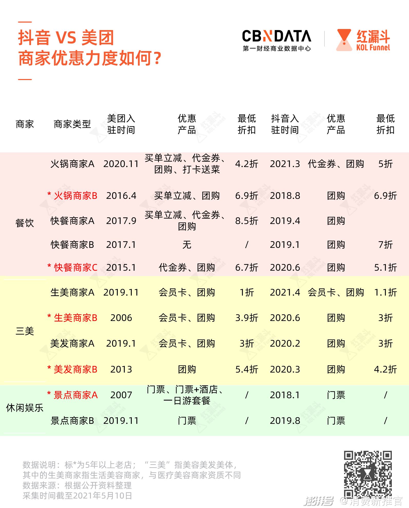 C站比较了10余家不同类型的商户,发现两个平台的优惠力度相差无几,只有极少数商家会为抖音提供专属优惠。尤其是成立5年以上的老店,不管是餐饮还是三美(美容美体美发)商家,在美团上的优惠产品都更加丰富。
