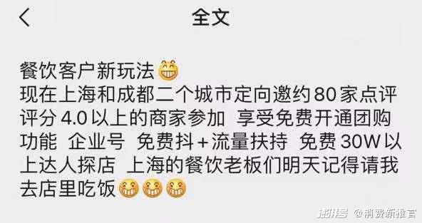 作为新入局者,抖音拿出了足够的诚意,不仅开放免费入驻,而且就C站了解,目前抖音对团购也不收取佣金,只收取少部分手续费,还会为商家定向开通抖音达人探店,增加曝光。换句话说,给抖音提供专属团购的这些商家,等于是花钱买一个新的流量入口。