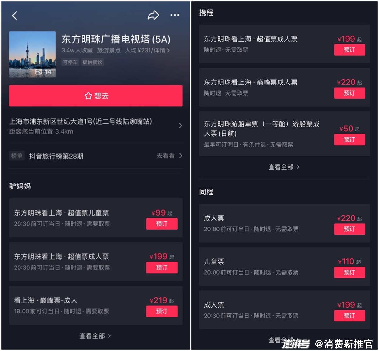 在酒旅行业,抖音已经接入携程系OTA平台。打开抖音上任意一个景点POI,会发现携程、同程、驴妈妈3个小程序入口已经开启。哪天在抖音刷 难难难到旅游博主的短视频下面挂上飞机、火车票预订链接,也不是没有可能,