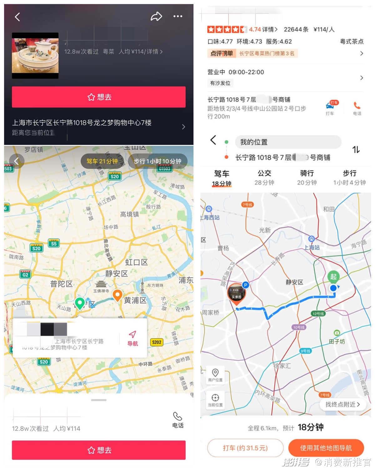 同一店铺,左为抖音POI页面,右为大众点评POI页面