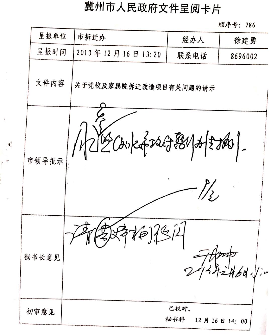 同年12月12日,冀州市征收办以上述文件等为依据,向冀州市政府请示,为加快冀州市委党校及家属院的整体拆迁改造、建设进度,“建议该项目边建设边跑办相关手续”。
