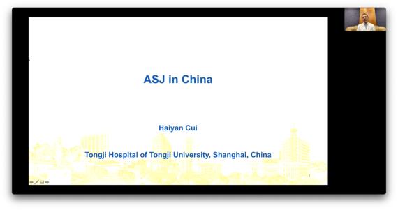 2021年3月,崔主任受邀于线上参加了ASJ editorial board meeting(ASJ编委会年会),并在大会上做了“ASJ in China”(ASJ在中国)的大会汇报,介绍了ASJ引入中国的工作,并且介绍了ASJ杂志与中国的整形美容外科学界共融共通、学习交流的情况,得到了编委会及国际同道的一致认可,引起国际上的热烈反响。