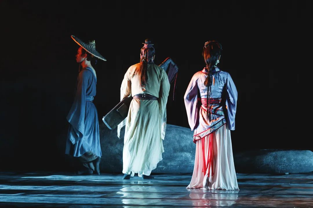 此外,该剧还巧妙地在“俞伯牙”与“钟子期”知己之间设立“伯牙妻”的角色,更加深刻全面地展现出阶层的隔阂、偏见,以及人物本身的情感复杂性,人物形象也更为立体饱满。伯牙、子期和伯牙妻的三人舞,变换了各种动作和空间,让角色表现层次更加丰富,饱满与立体人物形象向观众们传达出三人之间复杂的情感关系。