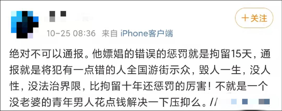 “试想,嫖娼这种事情即使公安机关不通报,当事者家属就一定不会知道吗?再说,发生这种事情,当事者理当主动告诉家里人,求得谅解才是,而不是瞒天过海,欺骗感情。”