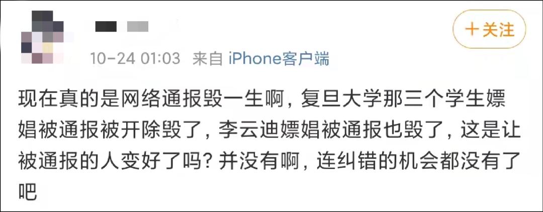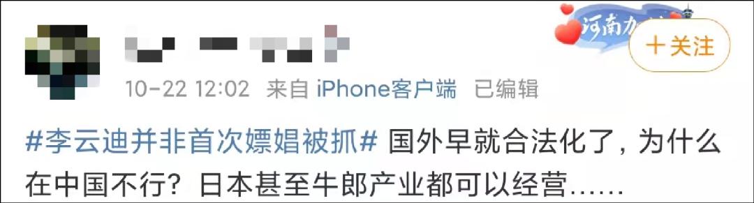 自李云迪嫖娼事件曝光后,相关争议持续不断,不少网友借由“单身人士有生理需求”“嫖娼不影响他人”等说法开始为李云迪“洗白”,其中不乏有名人大V甚至境外人士下场,不仅认为警方通报“小题大做”,涉嫌侵犯犯李云迪的个人隐私,还呼吁起了“嫖娼合法化”。