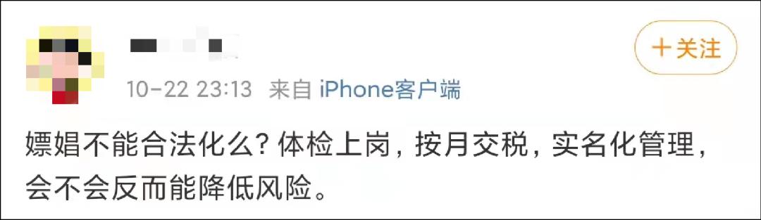 还有人借由此事提出“嫖娼应该合法化”的观点,还以“国外早就合法化了”作为理由。