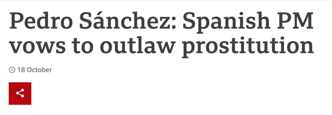 据英国广播公司报道(BBC)报道,当地时间10月17日,西班牙首相佩德罗·桑切斯在公开讲话中表示计划取缔卖淫,称卖淫行业是对广大妇女的奴役。