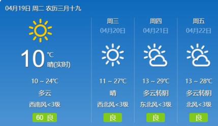 ▲18日(昨日),陕西省以多云间晴天气为主,最高气温较前一日略有回升。预计未来两天,陕西省以多云间晴天气为主,关中,陕南部分地方有零星小雨或阵雨,陕北将出现4~5级吹风天气。随着冷空气减弱,陕西省各地将进入升温模式,暖暖的春天即将回归。预计19日西安城区多云,8℃~24℃,其他区县多云,最低气温6℃~8℃,最高气温21℃~24℃;20日多云转晴天,10℃~27℃;21日晴天转多云,11℃~29℃。