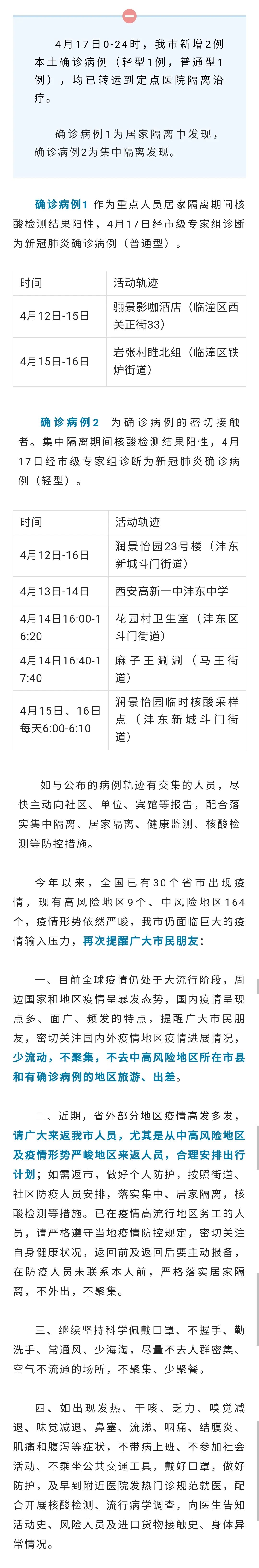 ▲4月17日0-24时,西安市新增2例本土确诊病例(轻型1例,普通型1例),均已转运到定点医院隔离治疗。确诊病例1为居家隔离中发现,确诊病例2为集中隔离发现。详见→