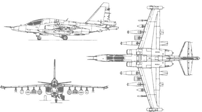 1968年,苏霍伊设计局开始设计一种于美国A-10相对应的单座、双发、亚音速的近距离空中支援攻击机,原型机在1975年2月首飞成功,并定名苏-25,北约绰号“蛙足”。在整体的外形设计上,苏25型攻击机采用的是高悬臂上单翼的机翼布局,机翼的整体为梯子型设计,在机翼的前端拥有一个大约为20度的后掠角。而这款飞机的动力系统被安装在后机身的两侧,发动机的进气道布局长度比较长,主要安装的是两台没有加力性能的“R-195”型涡轮发动机。在这款飞机的座舱及机翼前端的机体,以及机翼到垂尾之间的机体内为两个部分的油箱所在处,总共可以搭载大约5600升左右的航空燃油,并且在两侧机翼下还可以各搭载一个副油箱,每个副油箱的油料容量大约为850升。而苏25型攻击机座舱采用的是“K-36D”型弹射座椅,这一型号的弹射座椅能够在零高度、零速度的情况下也能够实施有效的弹射性能。