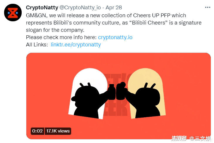 该系列由加密原生文化和内容平台“CryptoNatty”打造和发布,其于4月28日发文表示:“我们将发布代表Bilibili社区文化的Cheers UP PFP新系列,因为‘Bilibili Cheers’是公司的标志性口号。”
