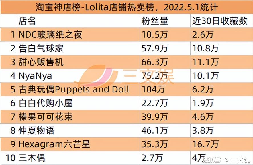 在Lolita店铺热卖榜上,NDC玻璃纸之夜、告白气球家、甜心贩售机、NyaNya、古典玩偶等品牌依旧稳定排在前十位。