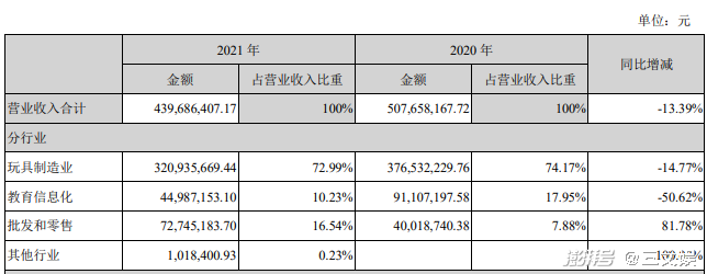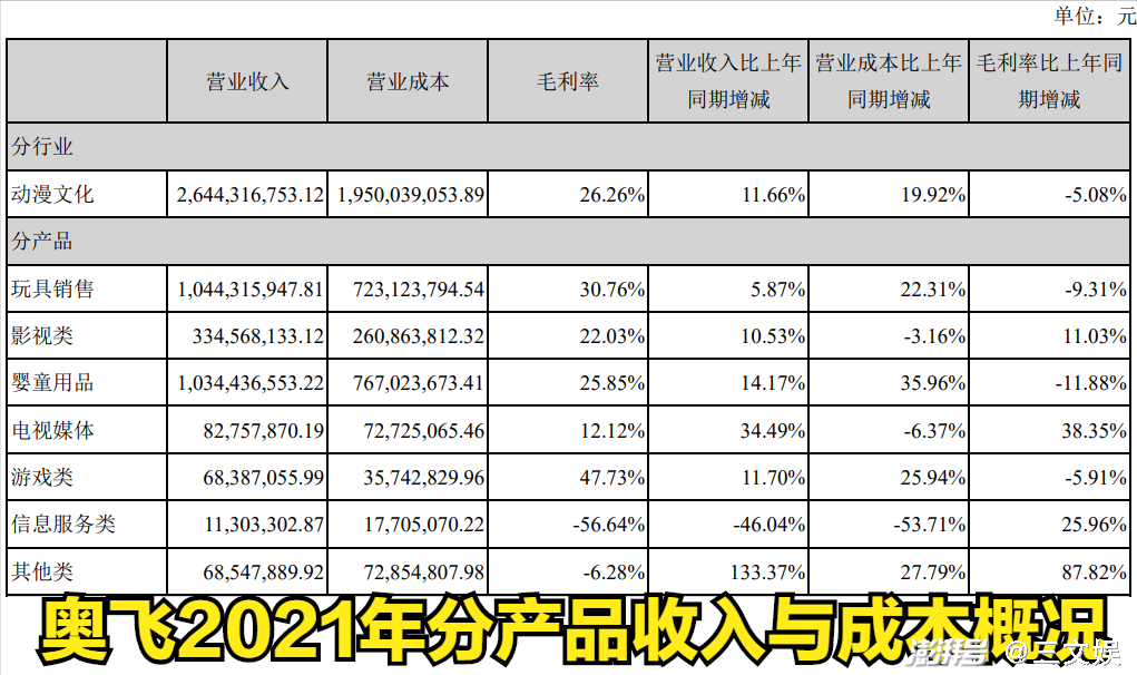 2021年,奥飞的玩具销售收入10.44亿元,同比增加5.87%,成本7.23亿元,同比增加22.31%;婴童用品收入10.34亿元,同比增加25.85%,成本7.67亿元,同比增加35.96%。