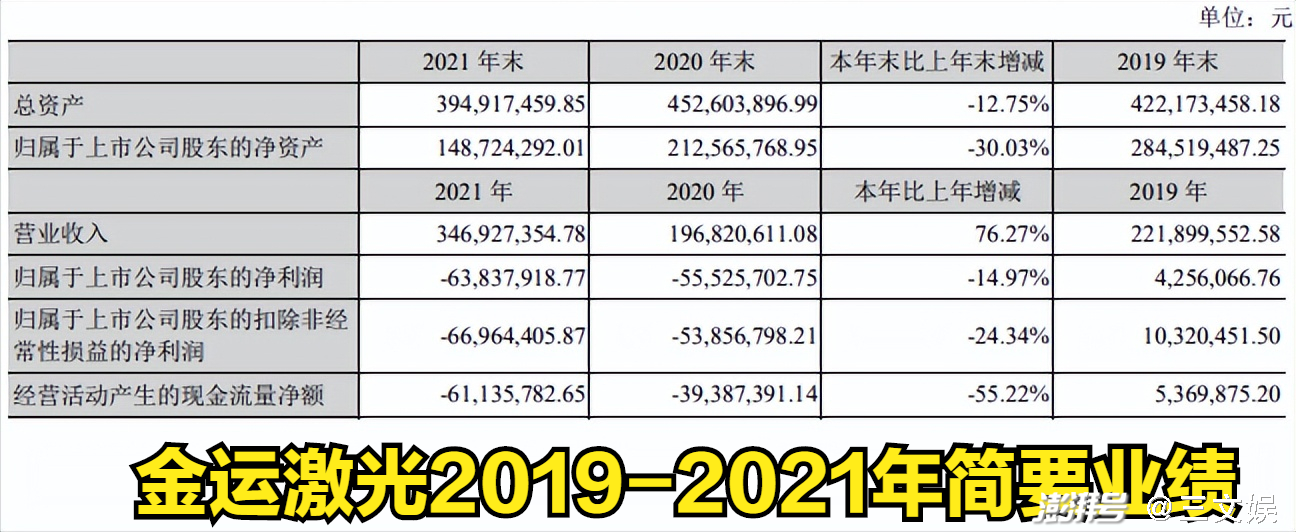 4月26日,金运激光发布了2021年年度报告。2021年,金运激光收入3.47亿元,同比增加76.27%;净利润为-6383.79万元,亏损同比扩大14.97%。