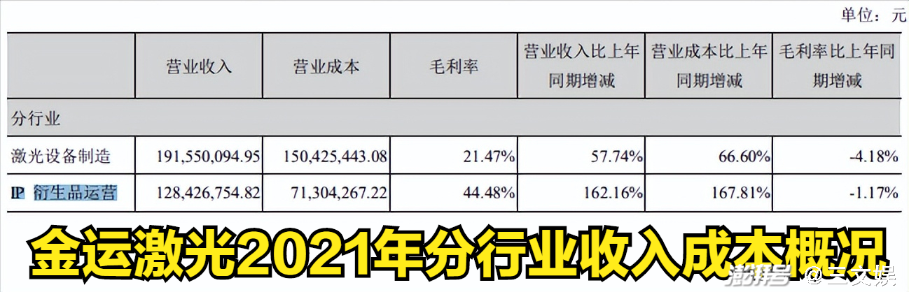 2021年,金运激光的IP衍生品(直销渠道以“IP小站”为自营品牌)运营收入达1.28亿元,同比增加162.16%;营业成本7130.43万元,同比增加167.81%。