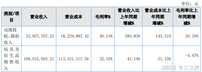 在精英动漫2021年的收入中,动漫授权及版权收入3383.78万元,同比增长283.83%;玩具及衍生品销售收入1.68亿元(占总收入的83.24%),同比增长41.14%。