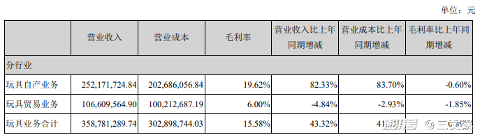 2021年,实丰文化的玩具业务收入3.59亿元(占营收比重98.19%),同比增长43.32%,营业成本同比增长41.83%至3.03亿元,毛利率同比增长0.89%至15.58%。