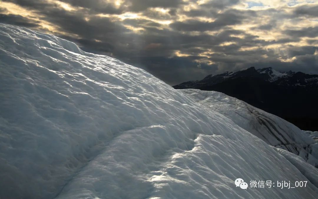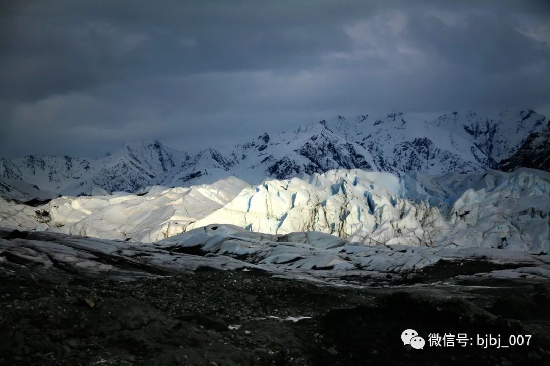终于,傍晚20点——在冰川上苦等了一个半小时后,漫天的乌云逐步裂开,一缕缕斜阳温柔地在冰川上缓缓扫描。