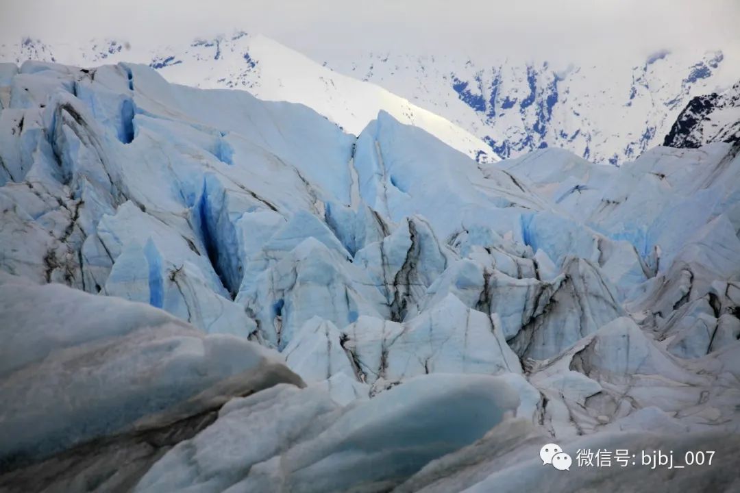 冰川的末端,除了冰碛堆成的山脊或山丘,更多的是即将崩裂脱落于冰川母体的舌形冰和塔形冰。这些奇形怪状的冰体,如同一座座形态各异的小山,起伏错落,波澜壮阔。