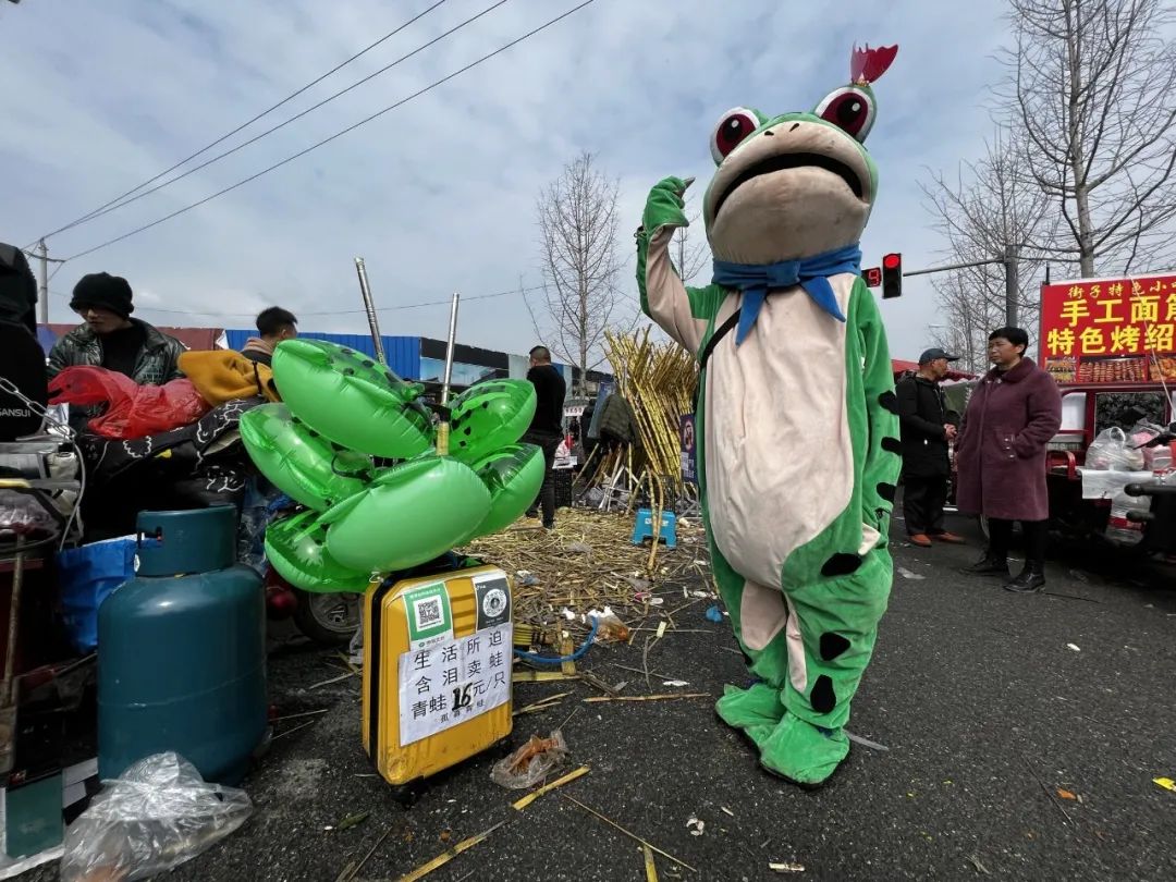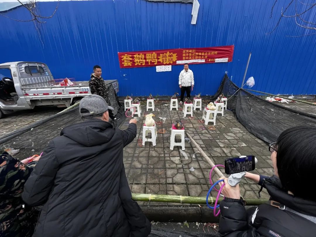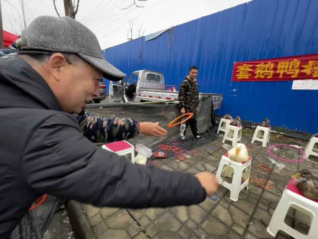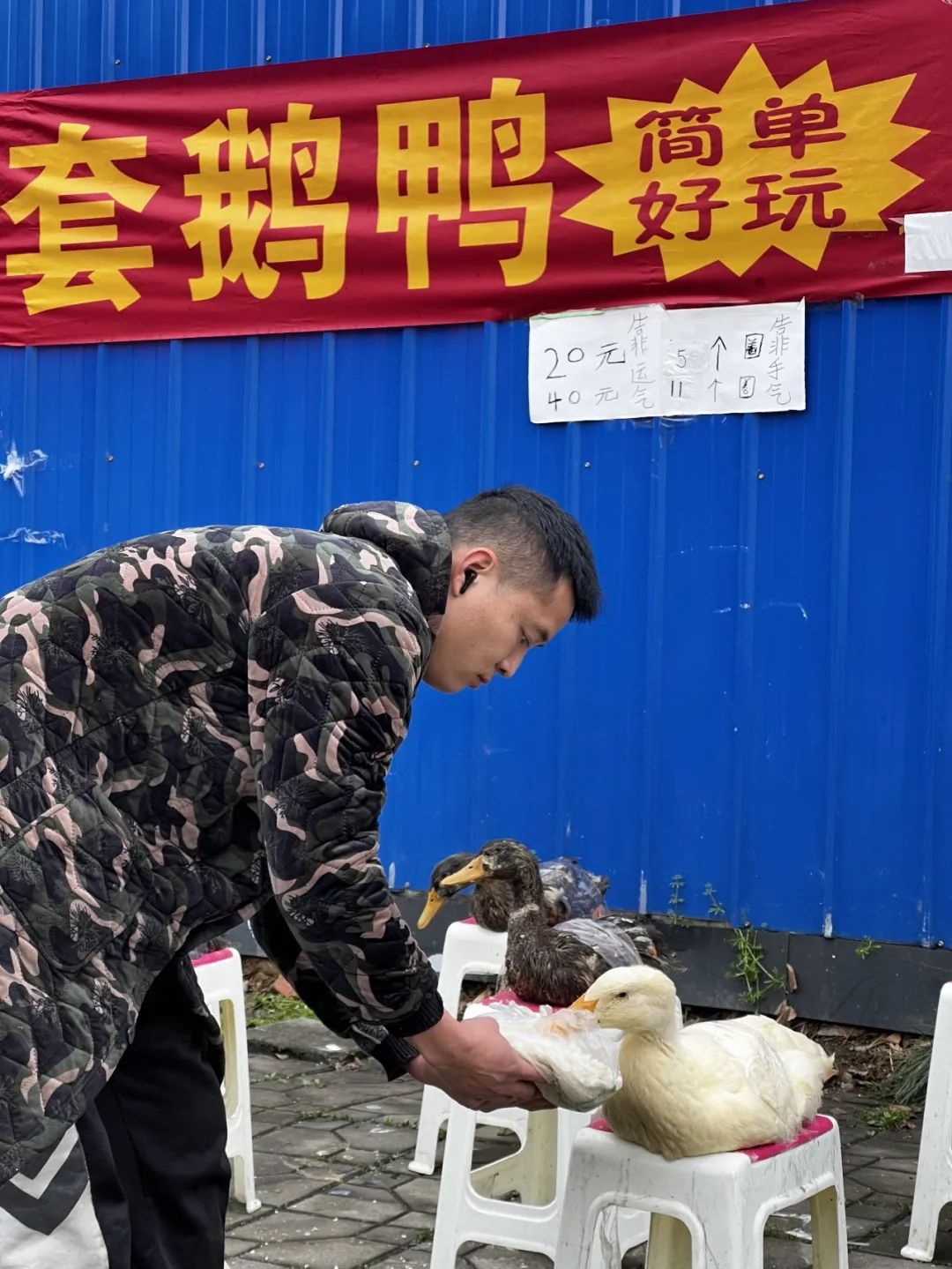 不变的是,春苔会上总有「套大鹅」这样的项目。20元5个圈,一般人不会玩,想想就套不中的,那转变思维,套个快乐,围观的人总比消费的人多。