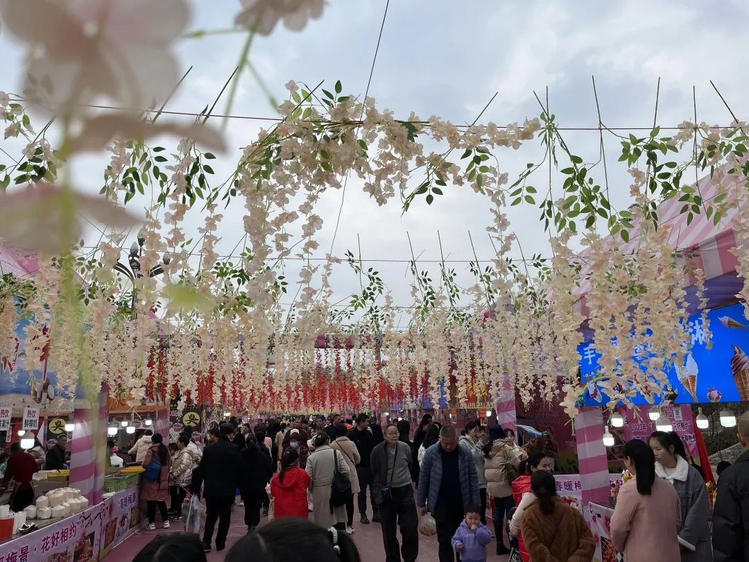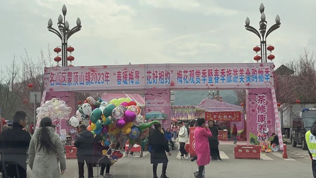在雅安也有,名山区蒙顶山镇的春苔会叫「“春暖梅景,花好相约”梅花观赏季暨春季旅游美食购物季」。整体视觉也精致,以两岸四周的梅花粉色为主视觉,空中吊挂花串,地上也有地毯,显得整洁光亮了许多。