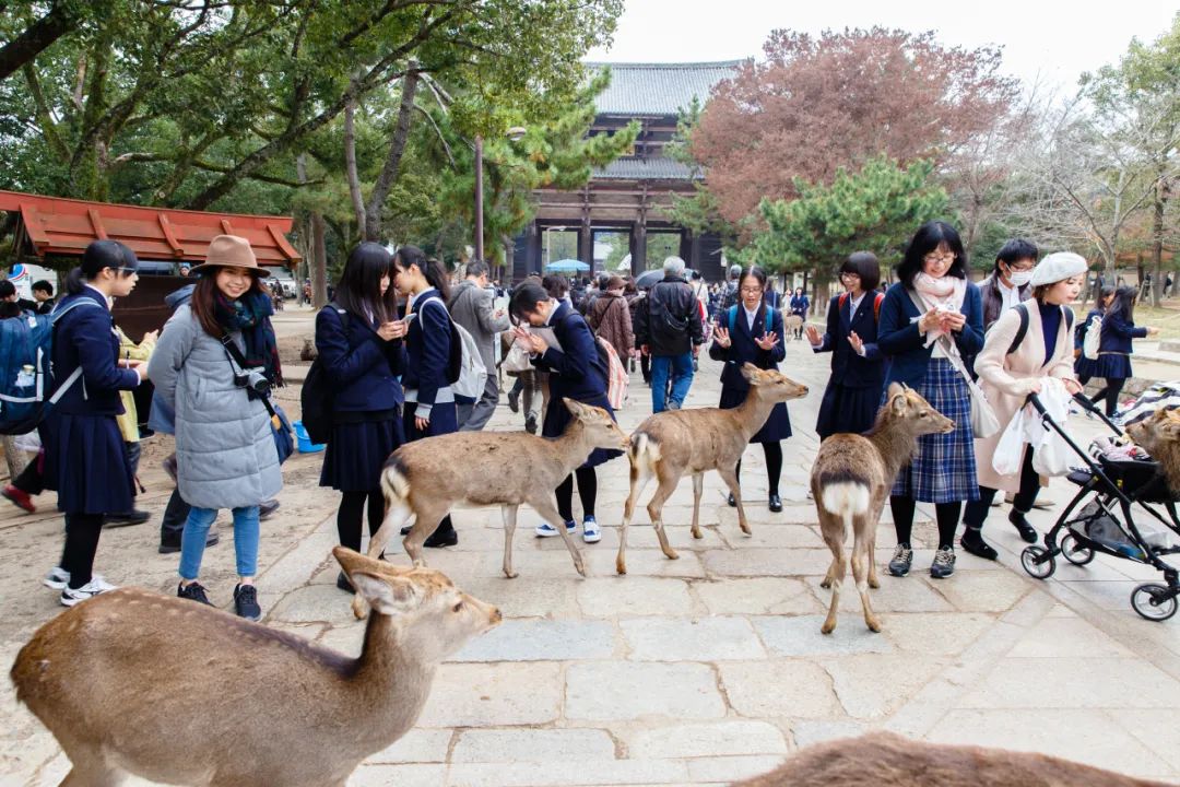 接着转战奈良,于京都相距不远,又有古佛等名胜,因此也是游客必至之处。奈良的大佛永远笑脸相迎,但奈良的鹿可不是,三五成群,结伴顶撞游客,只为讨要一种干粮饼,当地俗称“鹿仙贝”。