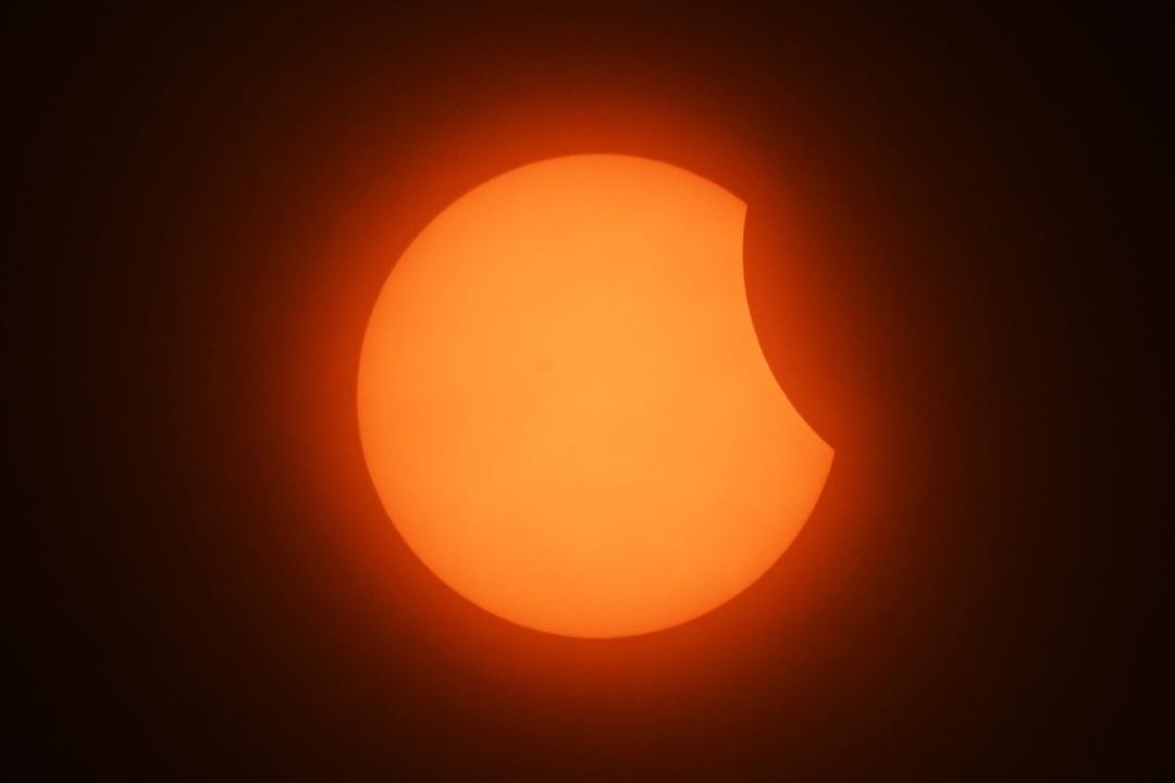 当地时间2024年4月8日,美国华盛顿特区,华盛顿纪念碑上空的日全食的日偏食阶段。同时,还要注意天气情况,以及观测位置的选择。
