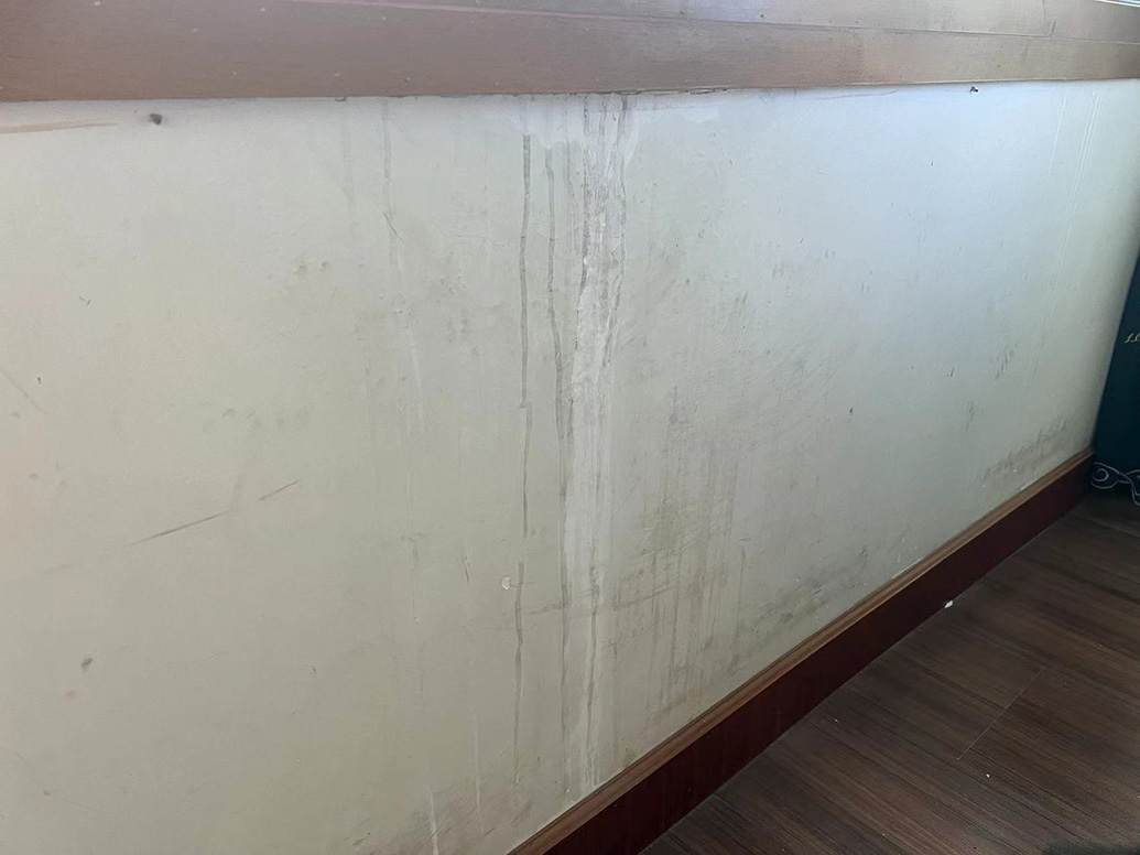 记者在孙大爷的房子中看到,他家二楼和三楼两侧的卧室均有不同程度的漏水情况,留下一大片水渍。墙面存在大面积“空鼓”的情况。孙大爷随手敲着一面承重墙,可以听见“咚咚”空心的声音。