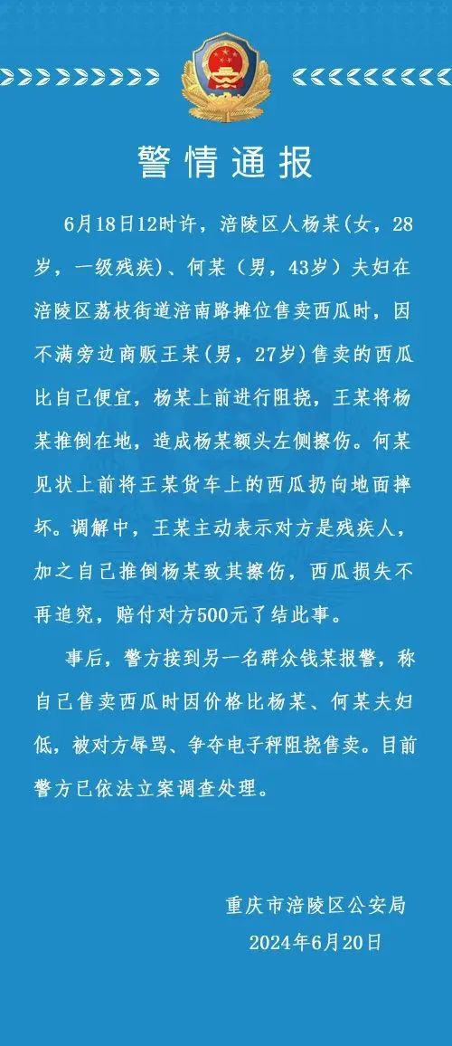 事后,警方接到另一名群众钱某报警,称自己售卖西瓜时因价格比杨某、何某夫妇低,被对方辱骂、争夺电子秤阻挠售卖。目前警方已依法立案调查处理。