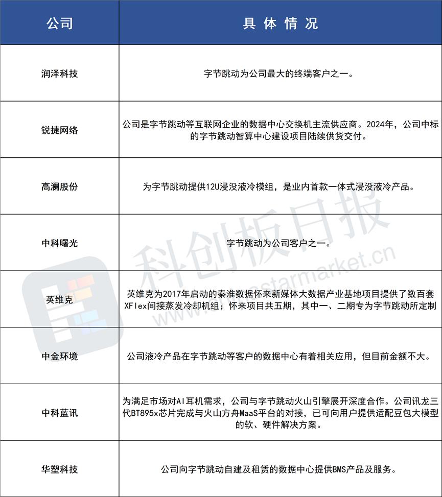 据《科创板日报》不完全统计,A股中字节跳动算力硬件相关公司有: