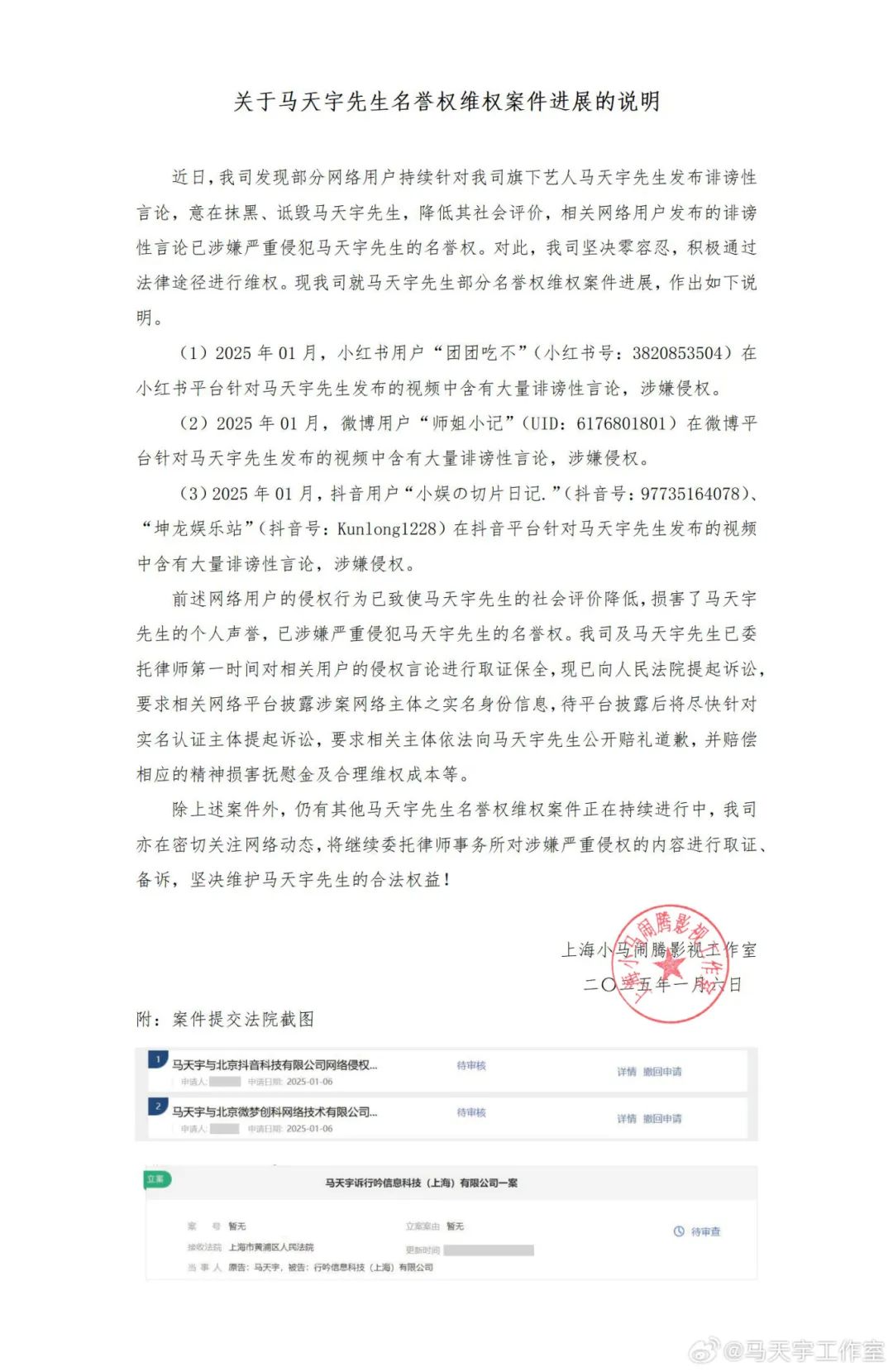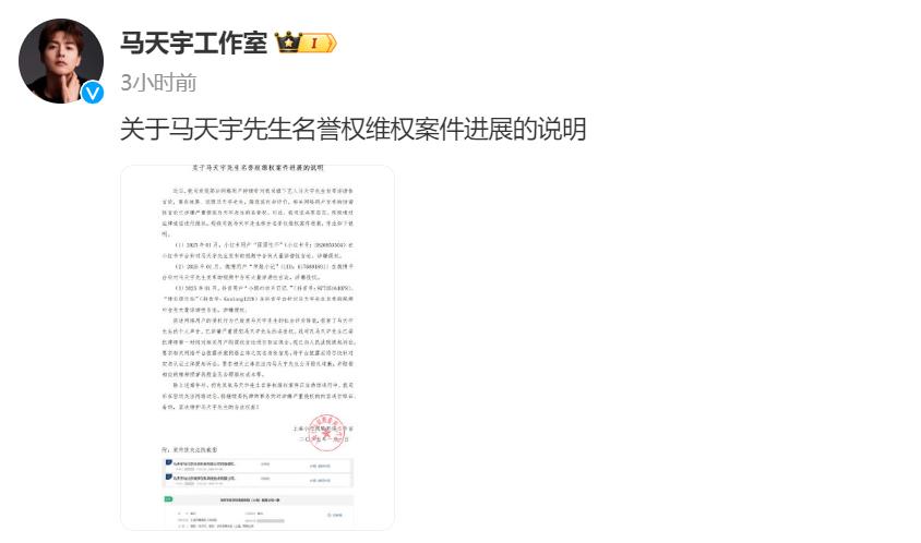 1月6日,马天宇工作室在社交网站发布《关于马天宇先生名誉权维权案件进展的说明》。