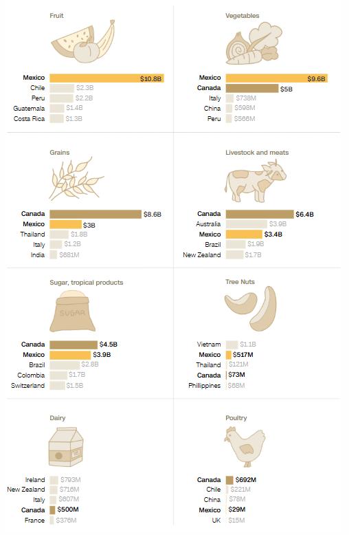 几十年来,墨西哥和加拿大一直是美国最大的两个农产品供应国。美农业部的数据显示,2024年1月至11月,美国进口的1960亿美元农产品中,墨西哥和加拿大两国合计占了近830亿美元。墨西哥供应的水果和蔬菜等农产品约占美国进口总量的23%,加拿大约占19%。