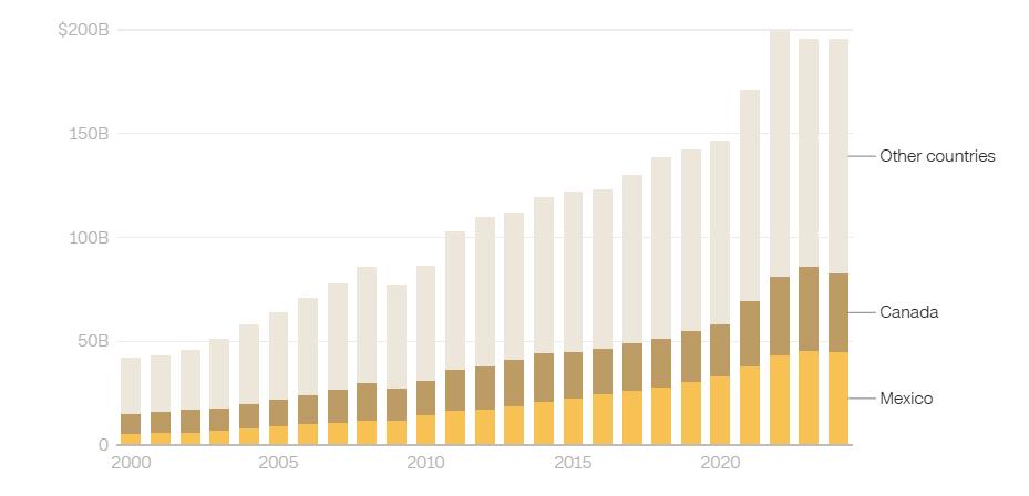 2000年至2024年美国农产品进口额变化 CNN此外,墨西哥和加拿大还是美国主要的贸易伙伴。美国商务部的数据显示,2024年1月至11月,墨西哥成为美国的第一大贸易伙伴,其次是中国和加拿大。美国从墨西哥、中国和加拿大进口的商品分别约为4670亿美元、4010亿美元和3370亿美元。