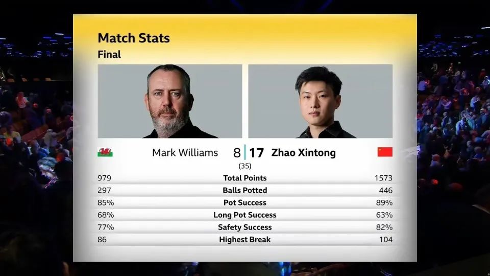 威廉姆斯此前共赢得三次世锦赛冠军(2000年、2003年、2018年),今年他的对手是出生于1997年的赵心童,二人之间22岁的年龄差距,创下了克鲁斯堡世锦赛决赛历史上的最大年龄差纪录。有趣的是,两人还都是“左手选手”。